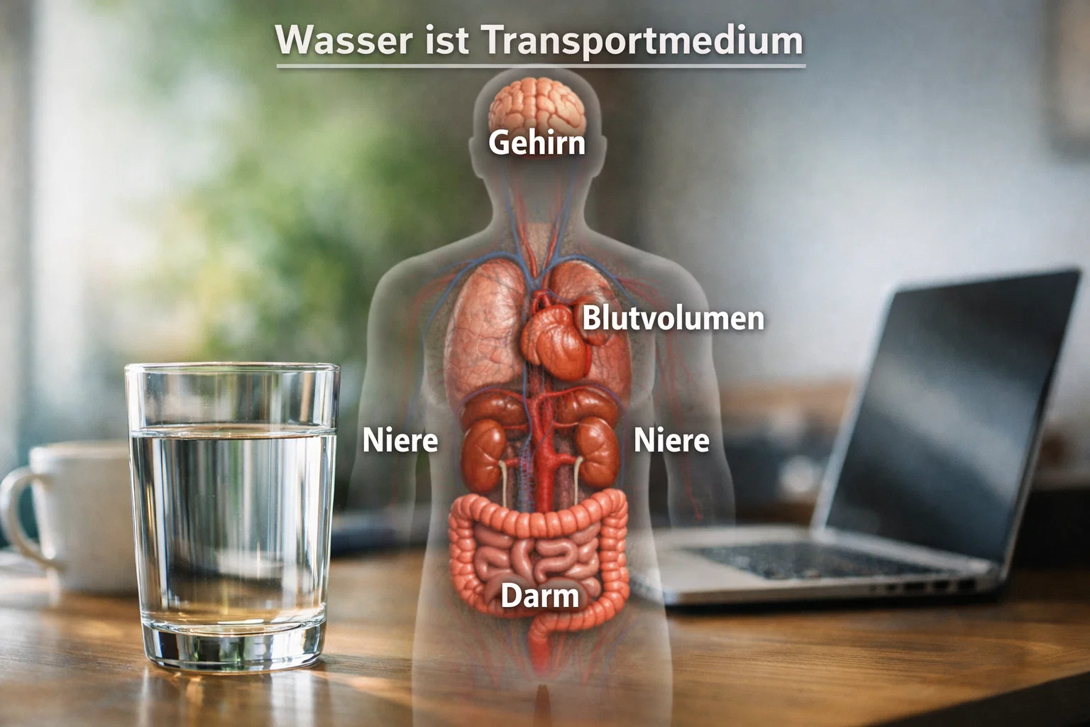 Der menschliche Organismus ist kein isoliertes System, das nur auf ein klares Signal wie Durst wartet, um dann in Ruhe auszugleichen, was fehlt. Er ist ein fein abgestimmtes Netzwerk aus Blutvolumen, Gewebe, Nieren, Darm, Hormonen und Nervensystem. Wasser ist dabei nicht einfach ein Getränk, sondern das Medium, in dem Transport, elektrische Signale und biochemische Reaktionen überhaupt erst möglich sind. Jede Zelle, jedes Enzym und jede Nervenleitung ist darauf angewiesen, dass ausreichend Flüssigkeit vorhanden ist, um Stoffe zu bewegen, Spannung aufrechtzuerhalten, und Abfallstoffe aus dem System zu tragen.